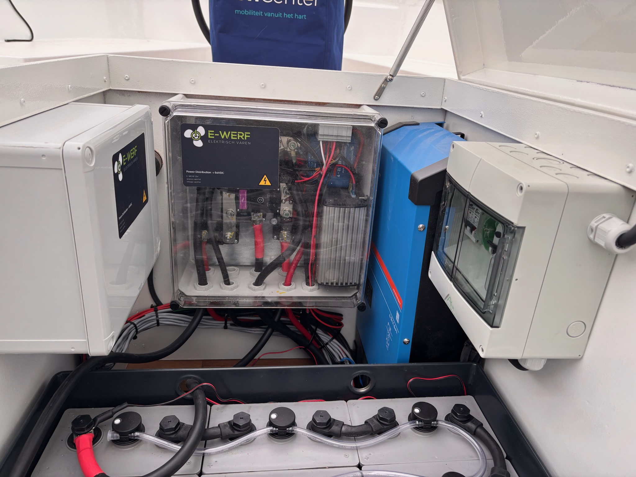 Het energiesysteem bestaat uit een lood/zuur tractiepakket met een capaciteit van 690 Ah (C5), goed voor circa 23 kWh netto energie-inhoud. Dit type batterij is gekozen vanwege de robuustheid en betrouwbaarheid in dit specifieke gebruiksprofiel. De energievoorziening wordt ondersteund door een Victron Multiplus II lader/omvormer en een Ekrano monitoring- en besturingssysteem. Deze combinatie maakt het mogelijk om zowel walstroomgebruik als boordverbruik efficiënt te beheren. De installatie is modulair opgebouwd aan de DC-zijde, waardoor onderhoud en eventuele uitbreidingen beheersbaar blijven.