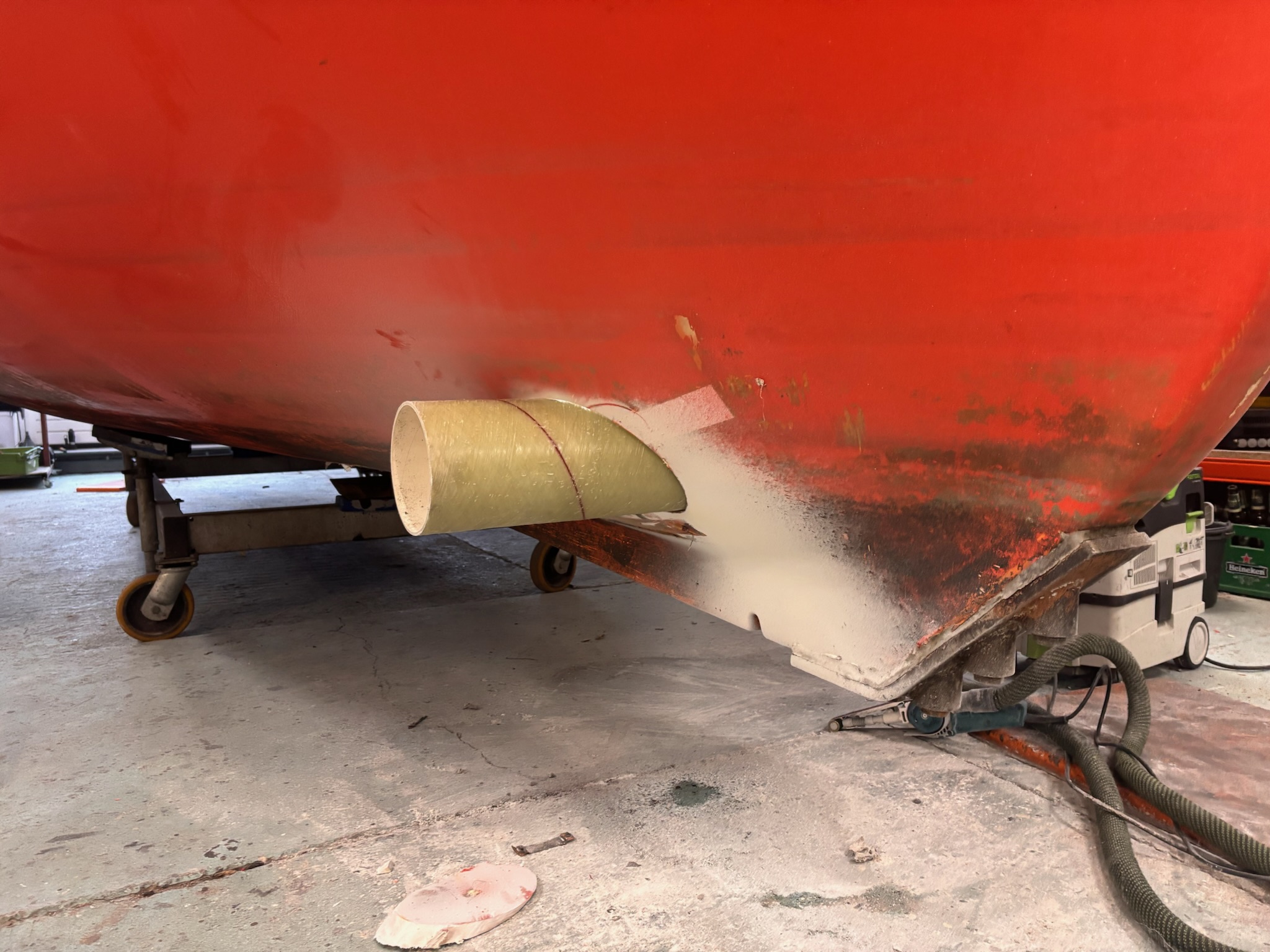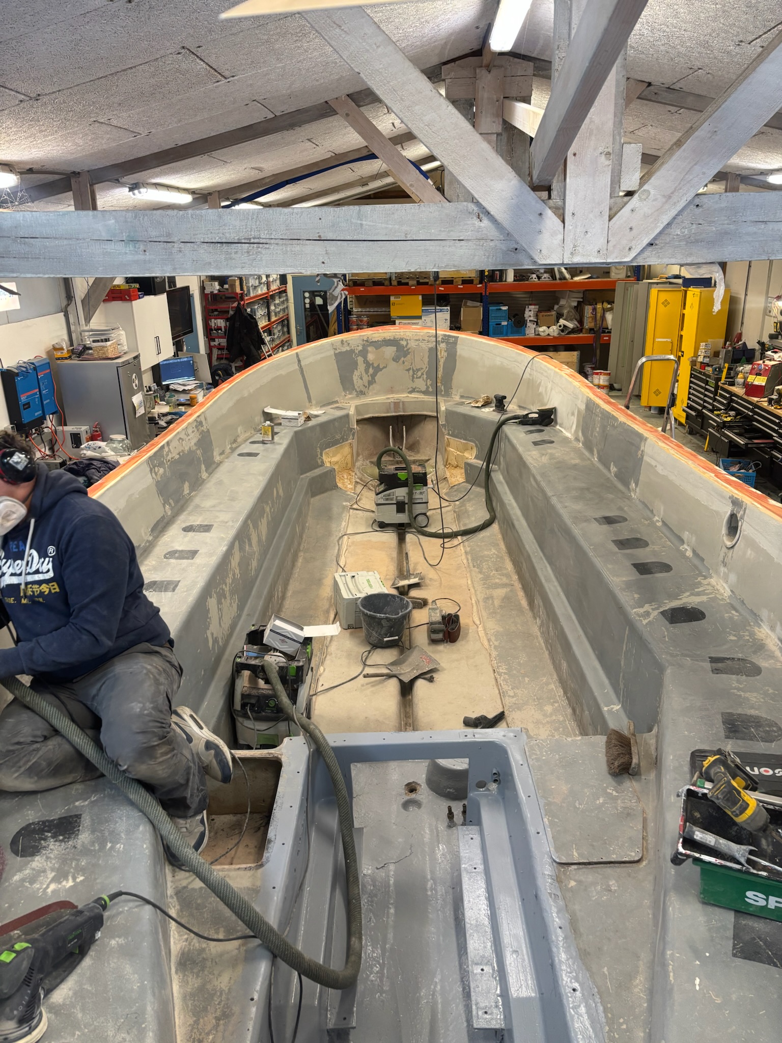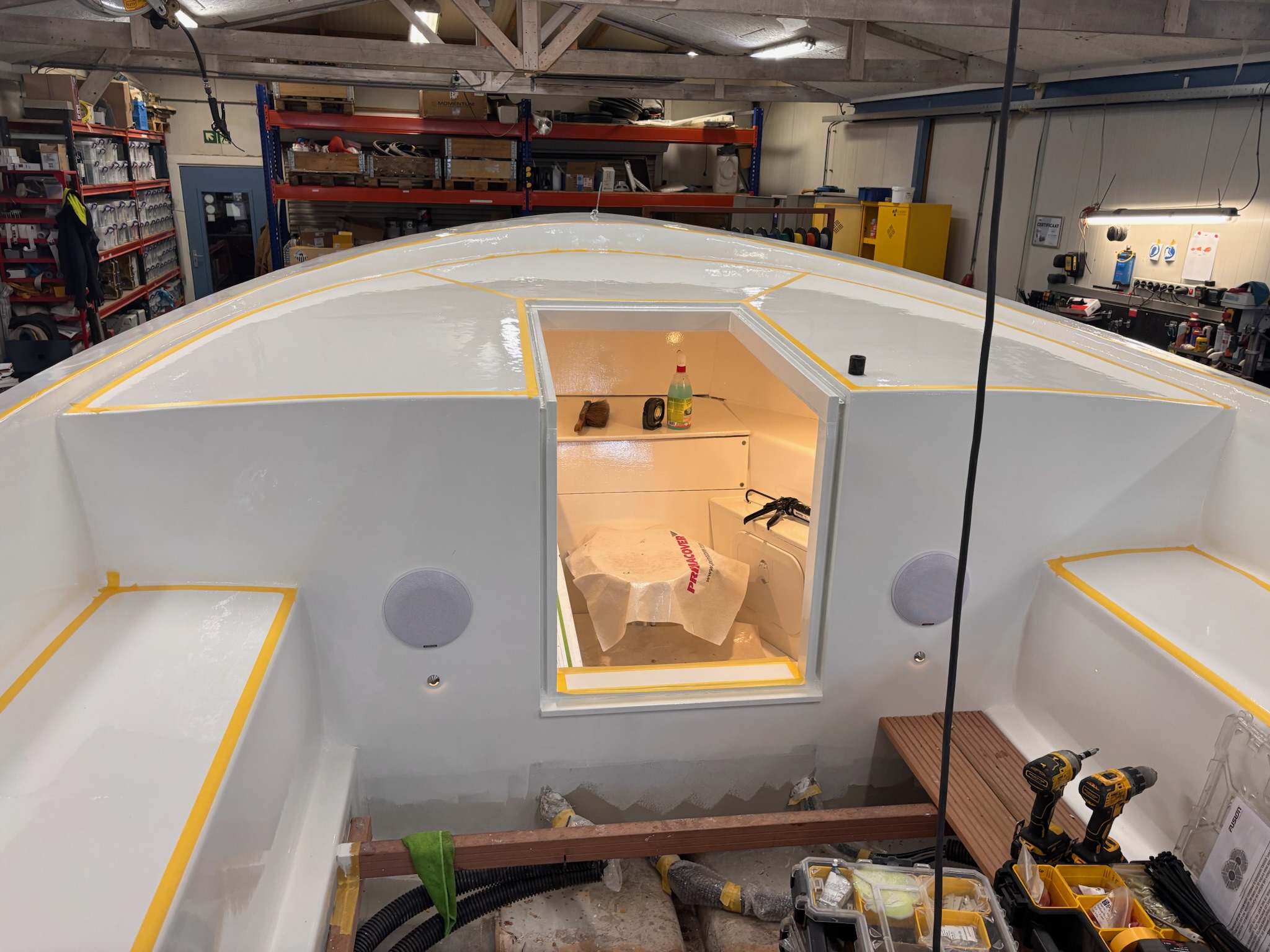 De basis van het project ligt in de herbestemming van het oorspronkelijke reddingssloepcasco. De rand is volledig geschuurd en opnieuw afgewerkt om een solide basis te creëren voor verdere opbouw. Het interieur is vanaf nul opgebouwd met een combinatie van hardhout en watervast gelamineerd multiplex. Alle constructieve delen zijn vervolgens gelamineerd met glasvezel en kunsthars. Deze aanpak resulteert in een stijve, onderhoudsarme en duurzame constructie. In het vooronder is een afgewerkte ruimte gerealiseerd met geïntegreerde verlichting, een koelkast en sanitaire voorzieningen. Door deze indeling ontstaat een functionele en comfortabele omgeving voor representatief gebruik.