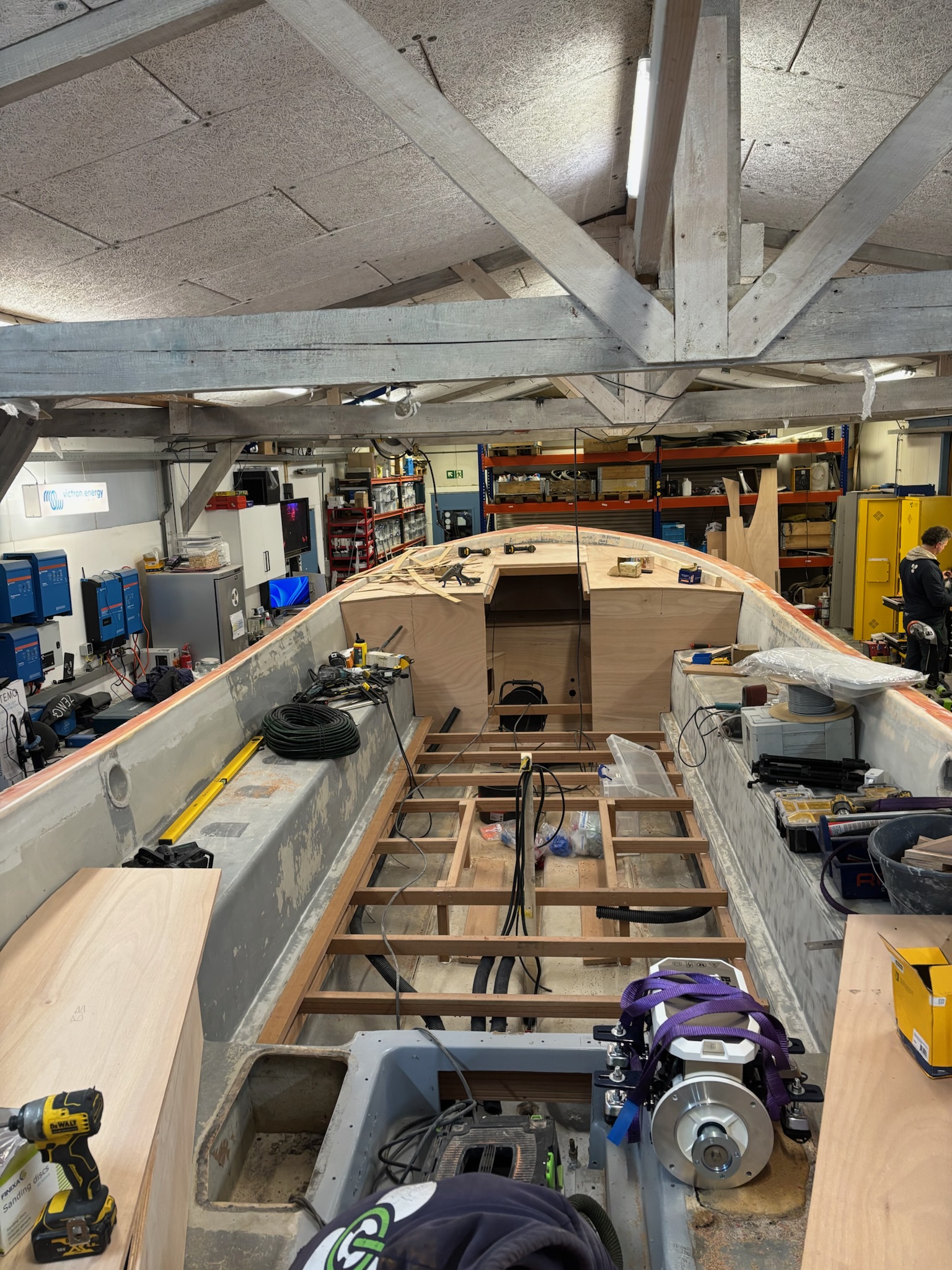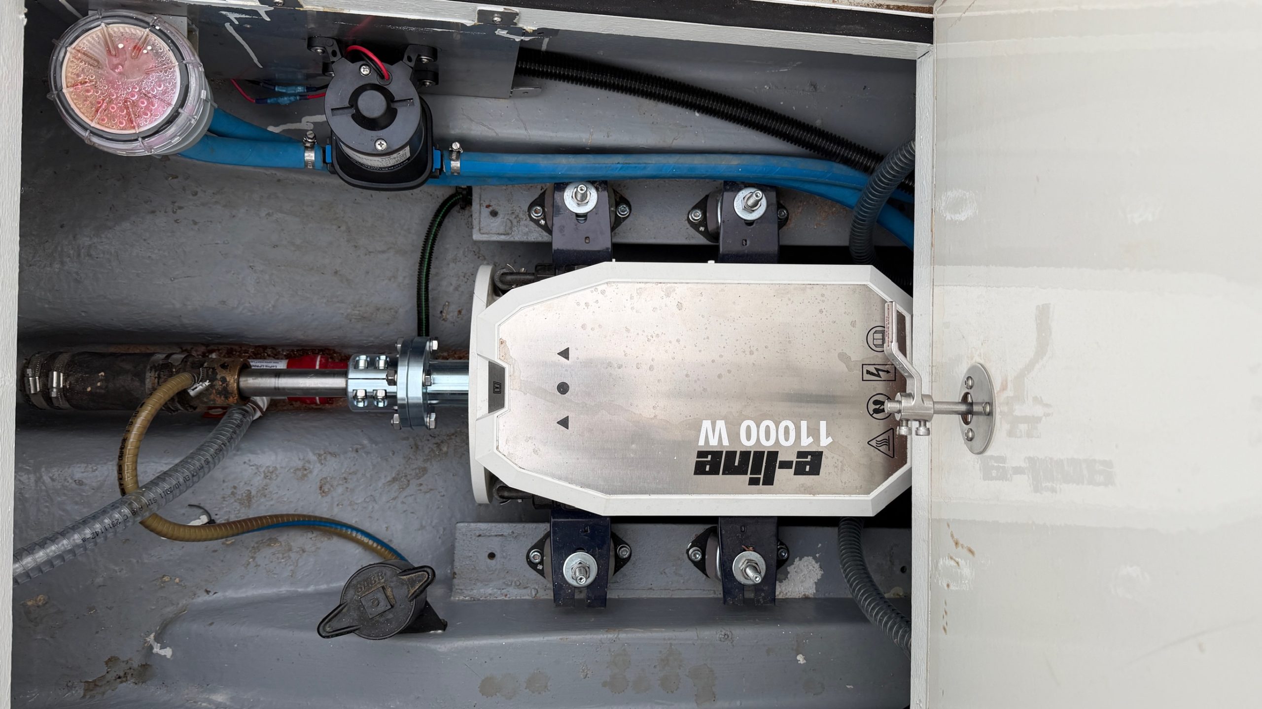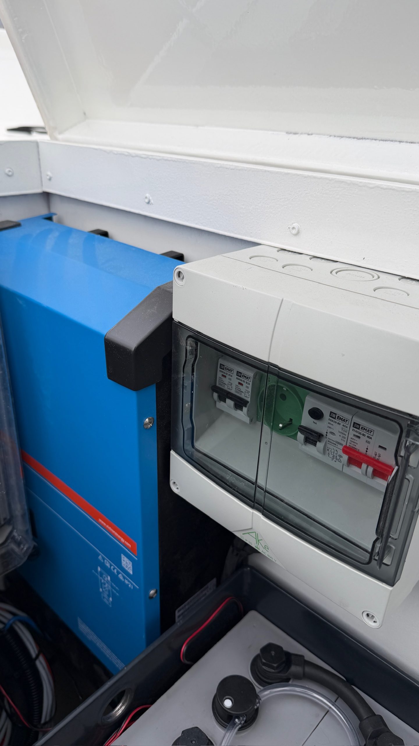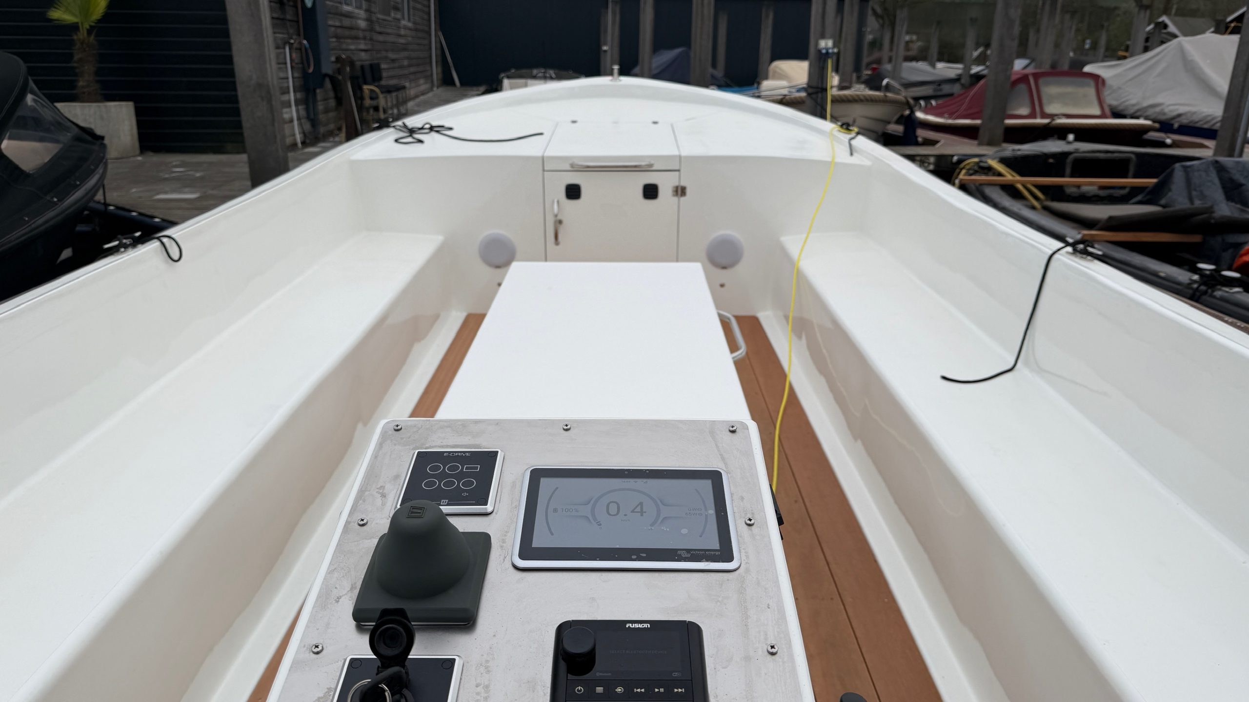 Aan boord zijn diverse energieverbruikers geïntegreerd, waaronder een koelkast, courtesy lights en interieurverlichting in het vooronder. Alle systemen zijn aangesloten binnen een overzichtelijke en logisch opgebouwde elektrische installatie. Via het Victron VRM-platform is het systeem op afstand uit te lezen en te bedienen. Dit biedt inzicht in energiegebruik, laadtoestand en systeemstatus. Voor de eindgebruiker betekent dit een hoge mate van controle en transparantie, zonder dat dit ten koste gaat van de eenvoud aan boord.
